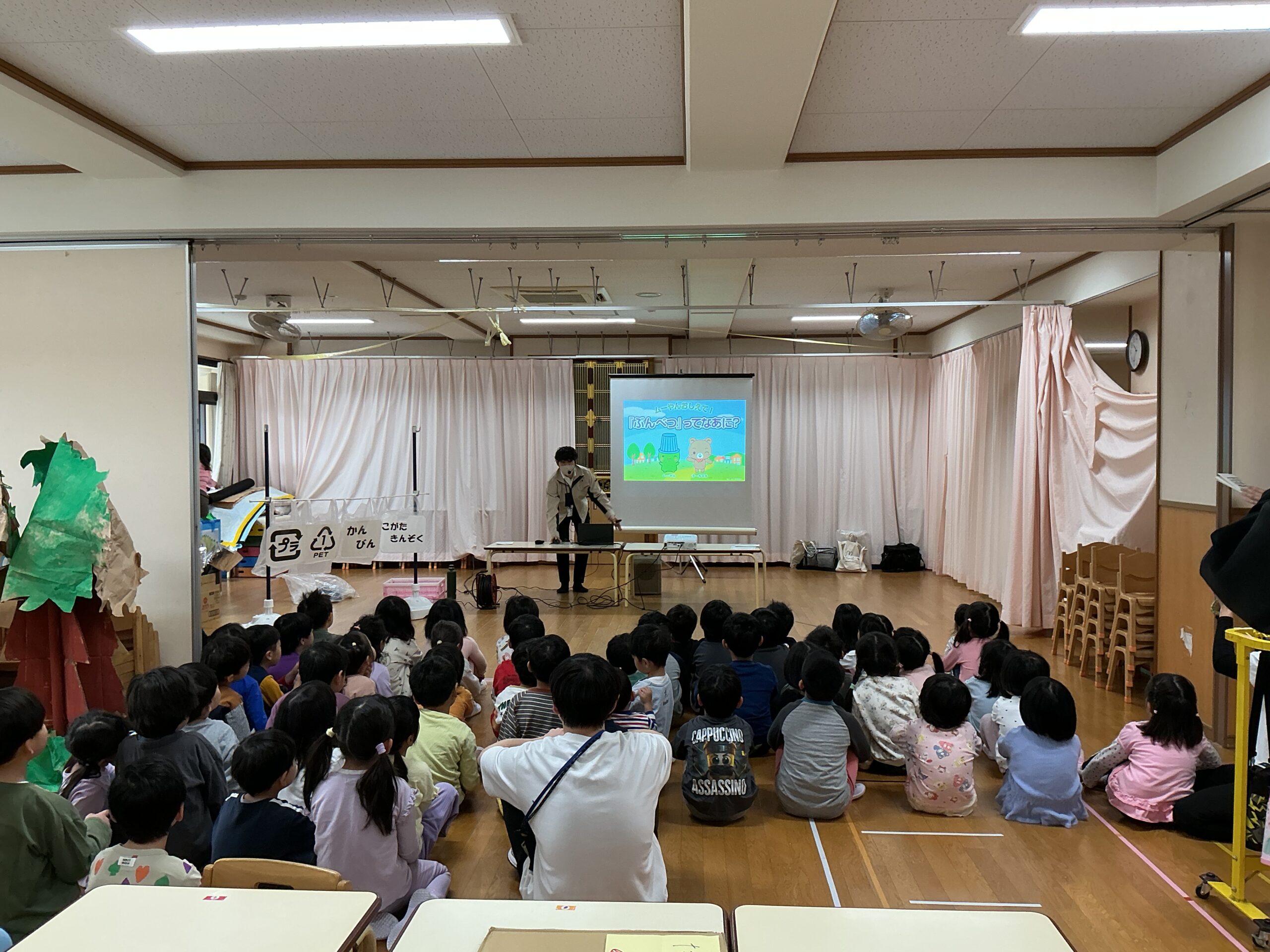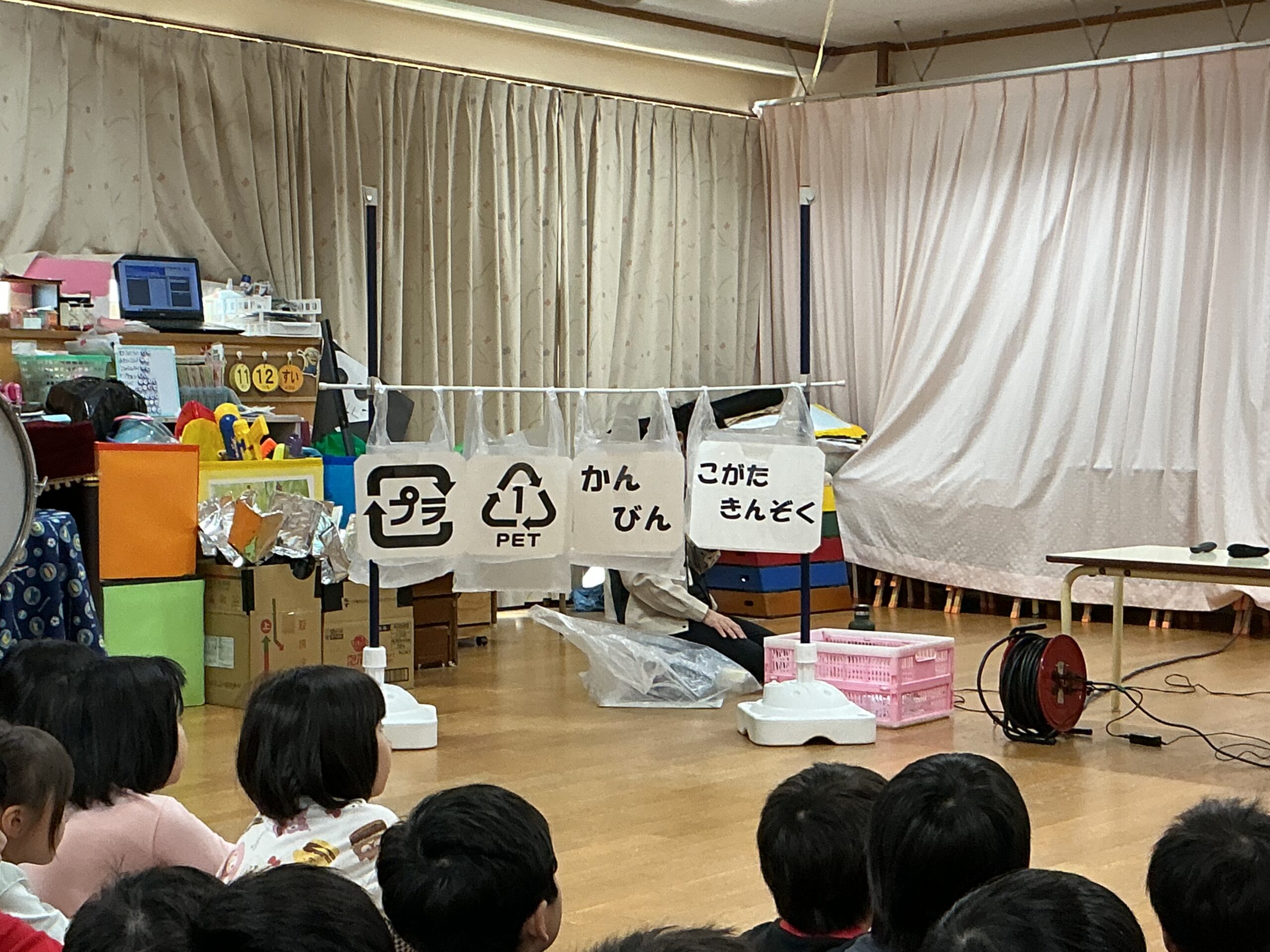 エコ講座 2025.11.12 今日は、4、5歳児がエコ講座に参加しました。お話を聞いた後、ムーやんに教えてもらいながら実際にゴミの分別を体験しました。 環境を守る事の、一つの取り組みとして、子ども達が出来る事を、大切にしていきたいと思います。 (R7.11.12)