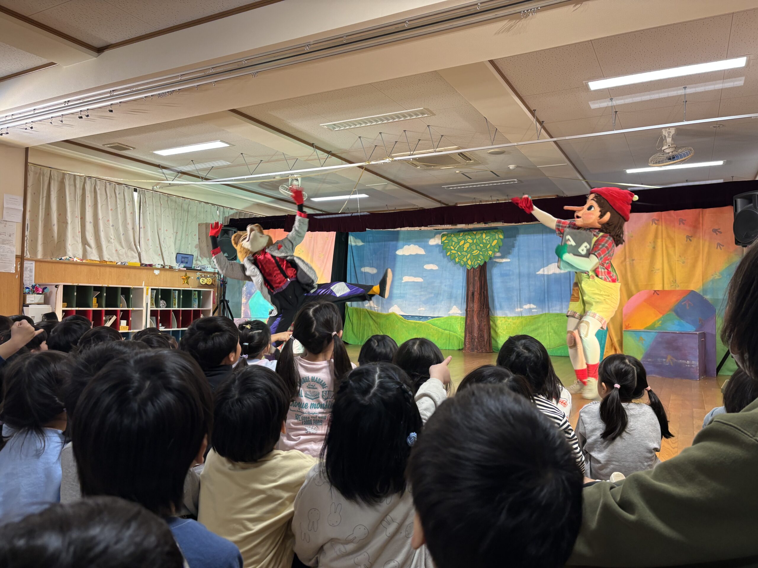観劇会 2026.02.14 劇団バンブーさんの『ピノキオ』の劇鑑賞がありました。楽しい劇で子ども達は夢中で見ていました。綱引き勝負をしたり、ピノキオや猫と触れ合い、写真撮影も出来ました。 (R8.2.12)